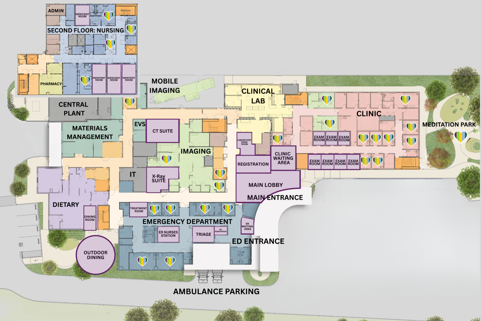 | Live Oak | $100,000+ | ER Treatment Room, Large Meeting Room, Imaging Waiting Area X-Ray Suite* Laboratory Draw Room* Clinic Waiting Area* Emergency Waiting Area* Dining Room* CT Suite* Main Registration Area* Triage room* Outdoor Dining Area* |